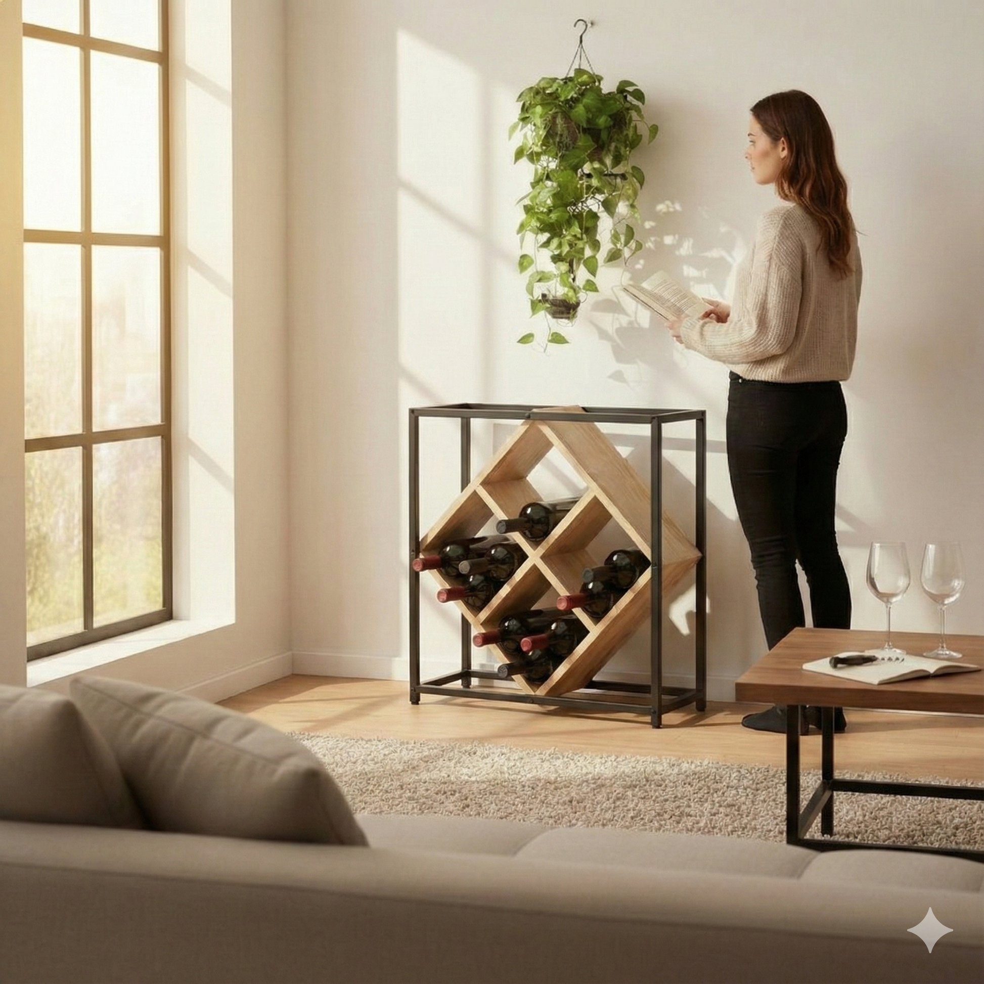 Ce porte-bouteilles allie praticité et esthétique pour sublimer votre espace. Fabriqué en bois d'ingénierie de haute qualité, il offre une finition mate lisse qui résiste aux rayures et apporte une touche chaleureuse avec sa teinte chêne ou noir. Le cadre en métal noir assure une stabilité impeccable, tandis que la forme en diamant optimise l'espace vertical sans encombrer votre pièce. Imaginez : vos bouteilles bien organisées, accessibles en un clin d'œil, que vous soyez un amateur occasionnel ou un passionné de vin. Les avantages sont évidents – il protège vos bouteilles des chocs, maintient une conservation idéale en position horizontale, et ajoute une note sophistiquée à votre déco sans effort.